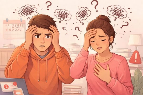 Os sintomas podem variar de pessoa para pessoa, mas alguns são bastante frequentes. Entre eles estão preocupação excessiva, medo constante, dificuldade de concentração, coração acelerado, tensão muscular, respiração rápida e dificuldade para dormir.